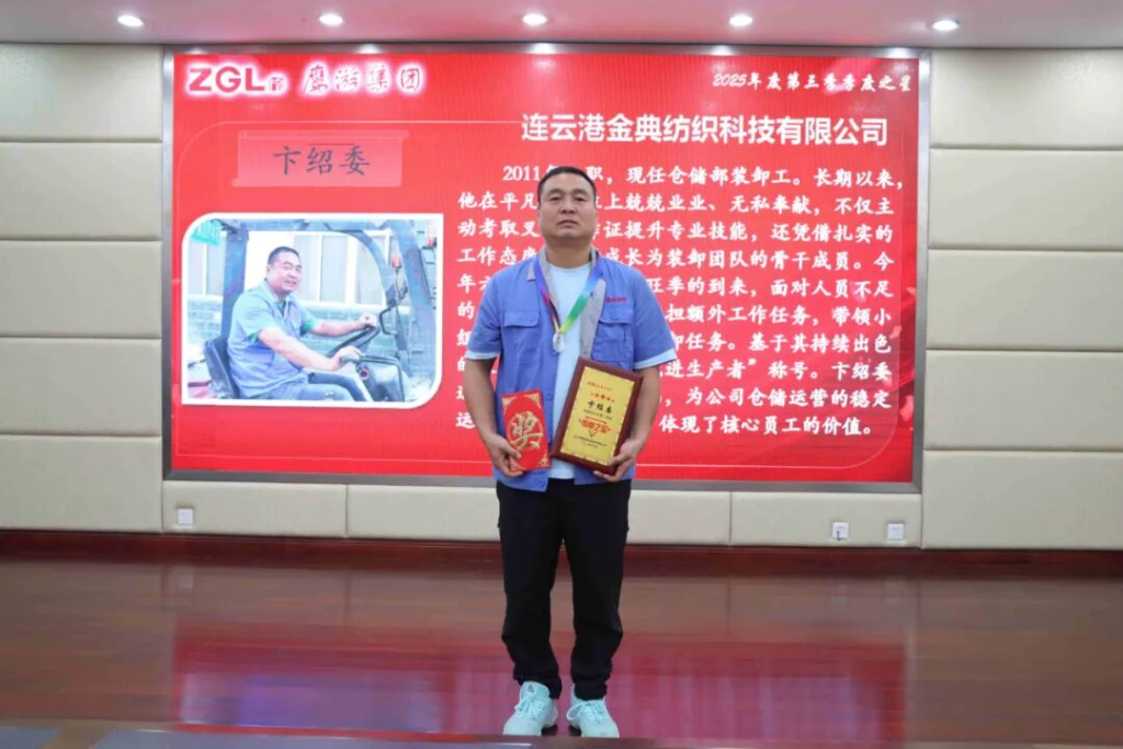 卞绍委,2011年加入金典纺织科技公司,现任仓储部装卸工。他积极进取,主动考取叉车操作证,提升专业能力,逐步成长为装卸团队的骨干。工作中,主动承担额外任务,带头攻坚,带领小组高效完成繁重装卸工作,每日加班无怨无悔,有力保障了生产连续性,体现出显著的模范带头作用。因其持续出色的表现,多次获评“先进生产者”称号。
