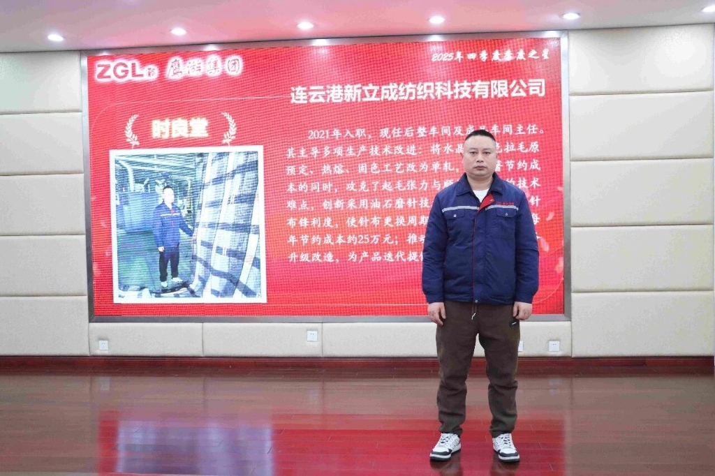 时良堂,中共党员,2021年加入鹰游新立成纺织公司,现任后整车间及成品车间主任。任职期间,他主导多项生产技术改进:将水晶超柔色拉毛多道工艺整合为单轧,节约成本的同时攻克技术难点,解决生产难题;创新采用油石磨针技术,将针布更换周期从1年延长至3年,降低企业成本;推动双面兔毛研发设备升级改造,为产品迭代提供关键技术支撑。