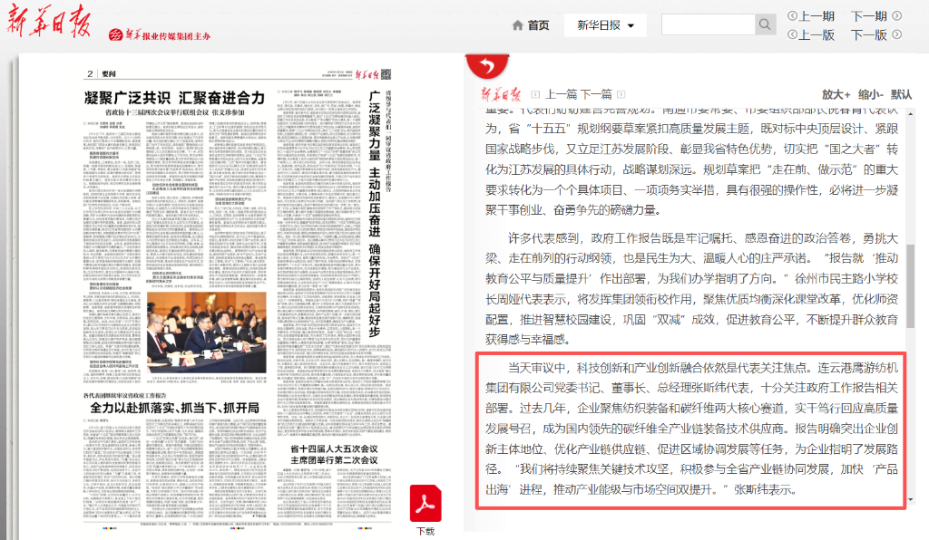 2月3日—6日,江苏省第十四届人民代表大会第五次会议在南京隆重召开。省人大代表、连云港鹰游纺机集团有限公司党委书记、董事长、总经理,中复神鹰碳纤维股份有限公司副董事长张斯纬肩负使命、认真履职尽责,围绕全省经济社会高质量发展积极建言献策,用实干践行代表使命。