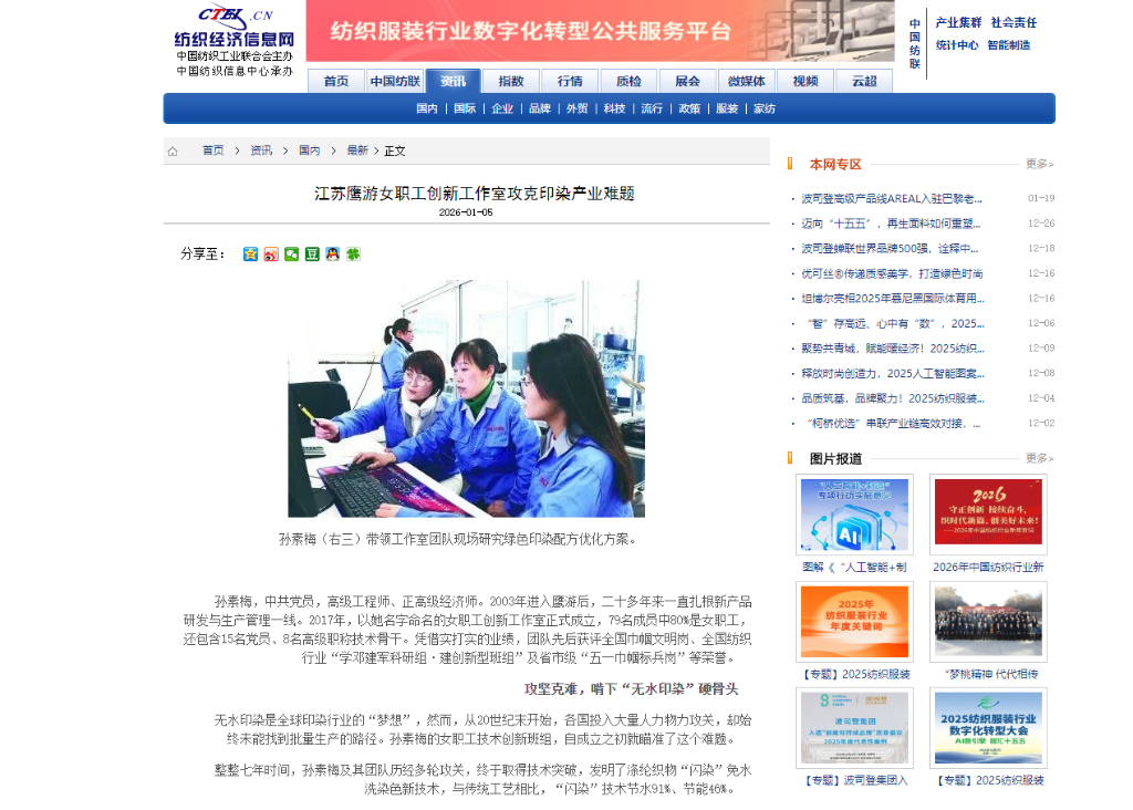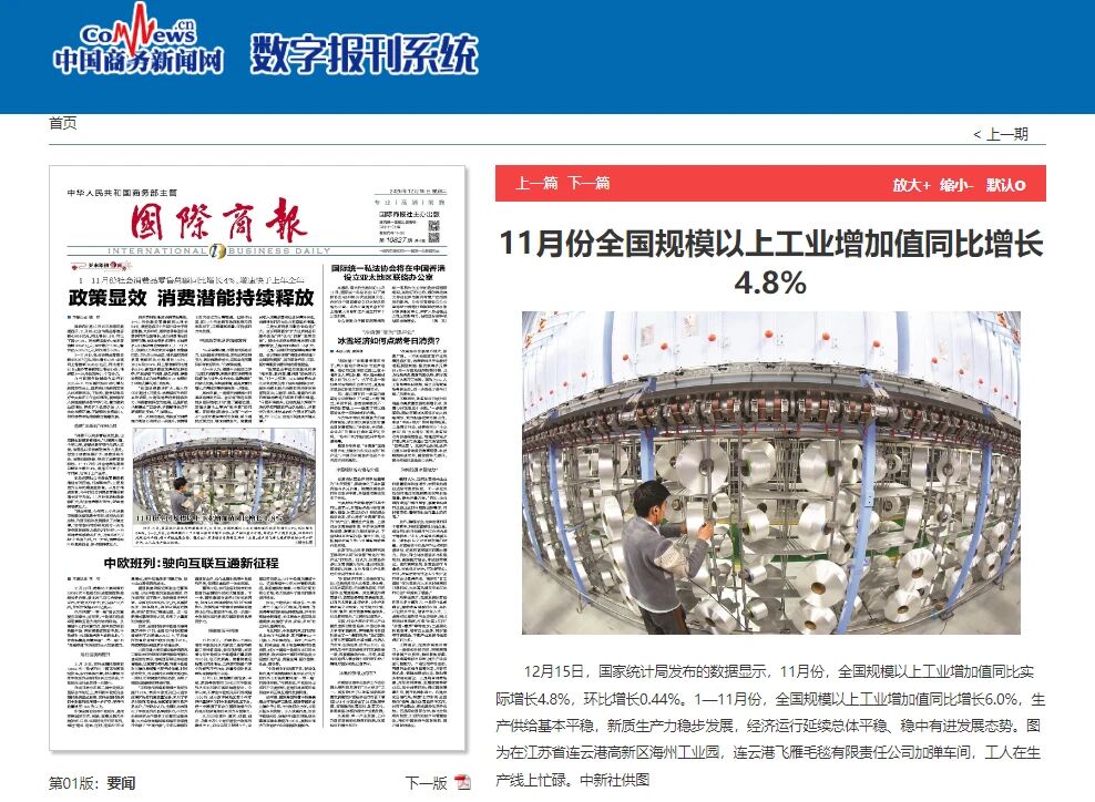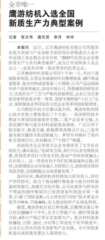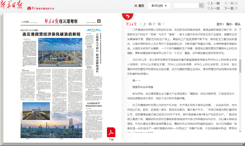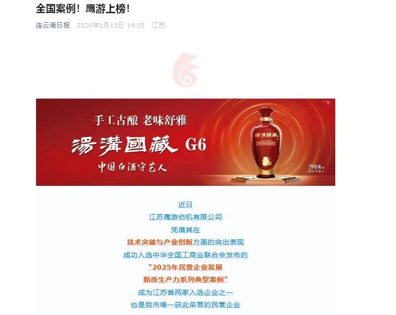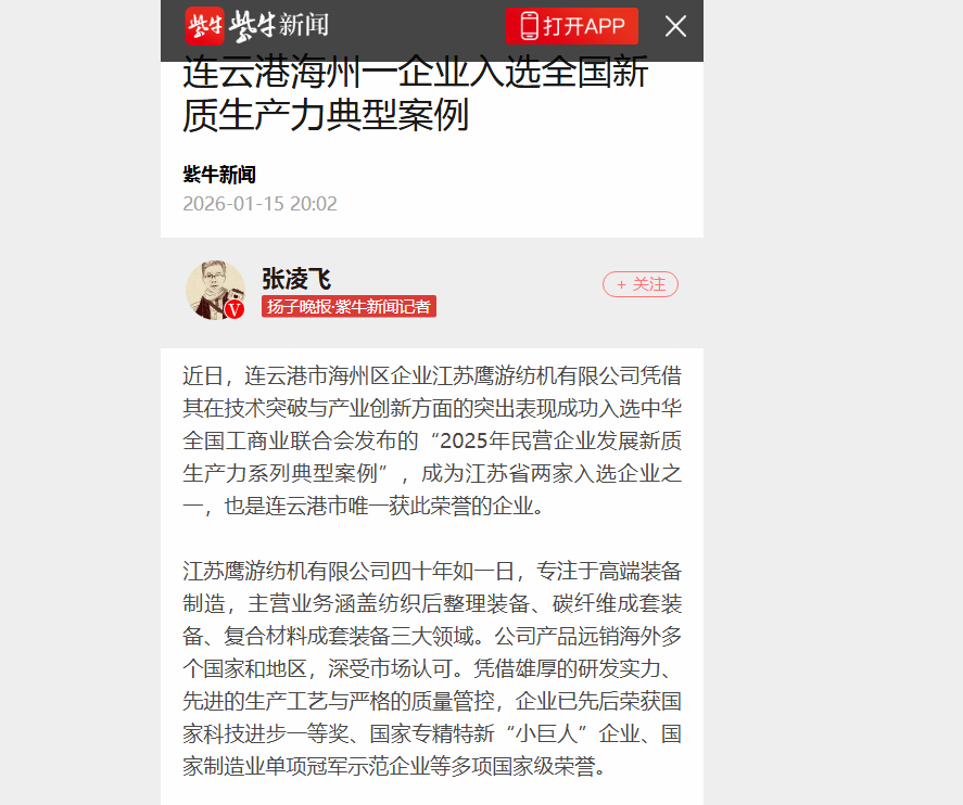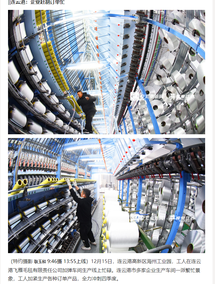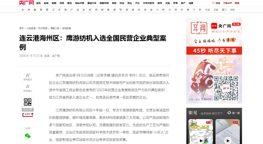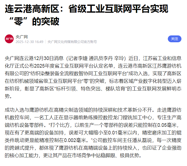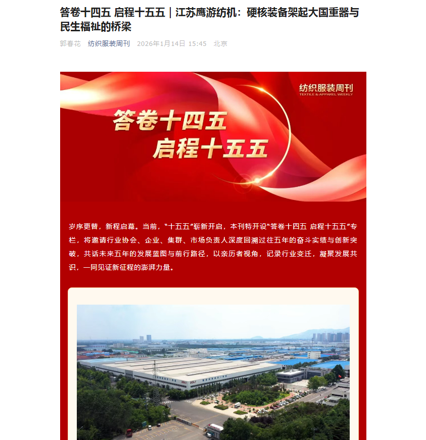 近期,新华社、人民日报海外版、央广网、中国妇女报、国际商报、中国纺织报、纺织服装周刊、东方企业文化、新华日报、江苏卫视、交汇点新闻、江苏工人报、扬子晚报、南京晨报、连云港日报、连云港电视台、连云港发布、苍梧晚报等中央级、行业级、省级及地方主流媒体,纷纷聚焦鹰游,从不同视角解读鹰游在产业升级、科技创新等领域的实践与成果。一起来看看都是哪些报道吧。